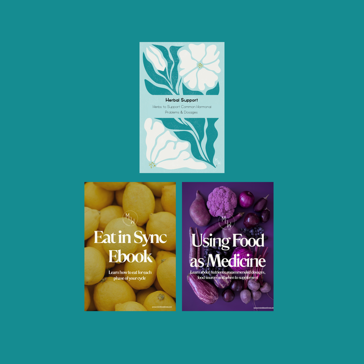 Your complete foundation for understanding your cycle, nourishing your hormones, and using the power of food + herbs with confidence. This bundle brings together Eat in Sync, Using Food as Medicine, and Herbal Support ($91 value) so you can reset your hormones naturally—without overwhelm, confusion, or guesswork.